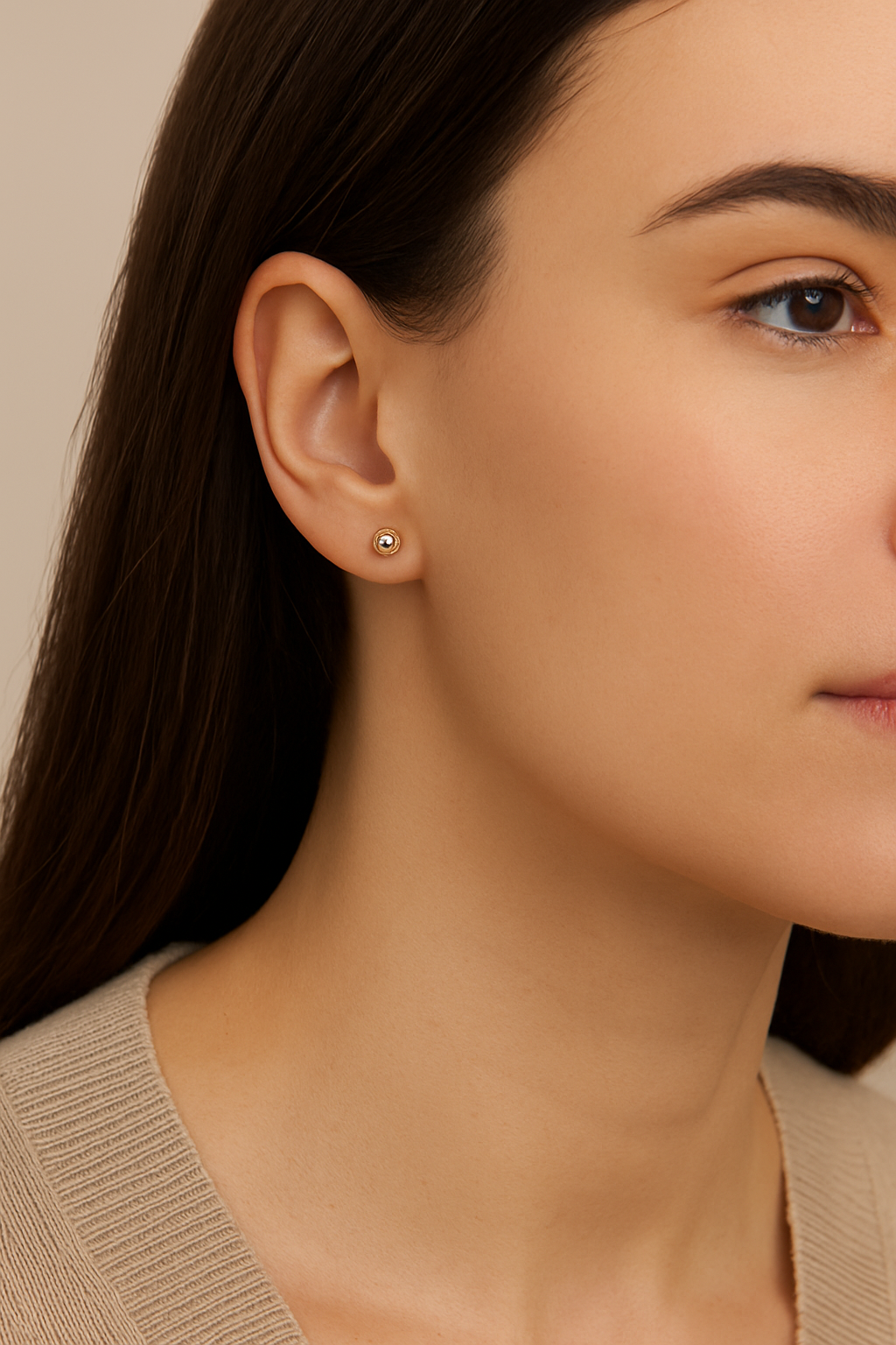 The Golden Dew Studs are a minimalist essential crafted in a sleek, polished gold tone. These dainty round ball studs offer a timeless look, perfect for daily elegance or a subtle touch of shimmer for any occasion.